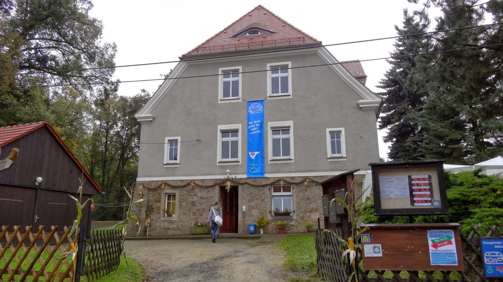 Da wir trotz der nun vollständigen Telefonnummer niemanden im Pfarrhaus Börln erreicht haben, machen wir uns Gedanken, wo wir denn noch die Nacht verbringen könnten, als wir große Strohballen am Wegesrand sehen. “Nur im aller größten Notfall!”, denke ich, als Andrea den Vorschlag macht. Dann betreten wir den Ort. Von Ortsdurchfahrten ist mir in Erinnerung, dass es hier viele Pferdekoppeln, Pferdeställe und ein Hotel gibt. An dem letzteren laufen wir gerade vorbei und sehen, dass es zu ist. Auch sonst macht der Ort einen “geschlossenen” Eindruck. Fast die Hälfte der Gehöfte stehen leer. Ist schon seltsam. In Lampertswalde sehen wir ein blühendes Dorf mit schmucken Häusern und engagierten Einwohnern. Und hier gar nicht so weit weg, geht alles den Bach runter. Die Turnhalle scheint noch ein beliebter Treffpunkt zu sein. Überall hängen Tafeln, die Werbung für Tischtennis in der Halle machen. Ja und die Eisdiele läuft gut, was wir später noch überprüfen werden. Andrea ist zwar auch heute wieder “schön gelaufen” aber zuerst heißt es die Rucksäcke los werden. Das Pfarrhaus ist auf Grund der guten Ausschilderung schnell gefunden. Auch hier hängt ein Zettel im Fenster mit Kontaktpersonen. Die zweite Nummer funktioniert dann. Es meldet sich eine Frauenstimme, die uns sagt, dass sie noch in Dahlen ist und in 20 Minuten bei uns sein wird. Wir setzen uns im Pfarrgarten unter eine Art Laube und sehen zu, wie sich ein Mann an der Natursteinmauer des Grundstückes zu schaffen macht. Er hat zwar den Schlüssel zur Garage aber nicht den zum Haus. Doch dann fährt ein Auto vor und wir werden eingelassen.
